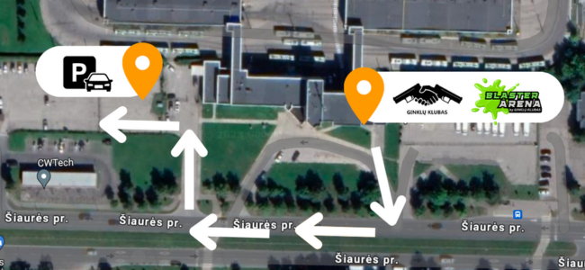 Šalia esantis privatus parkingas Ginklų klubo lankytojams tik 1 Eur, o turintiems kuponus NEMOKAMAI - atvykus skambinti +37064069242
